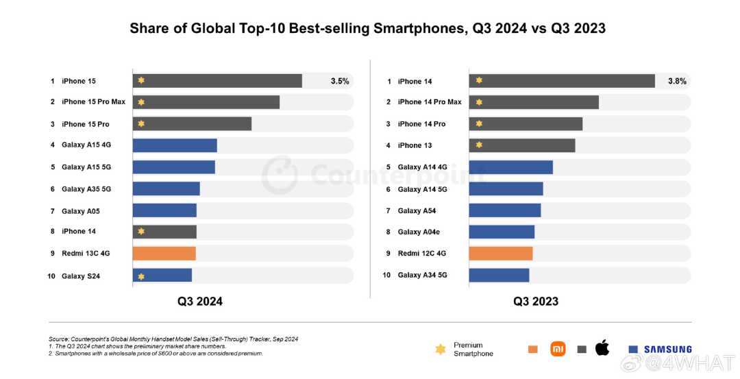市场调研机构Counterpoint公布的2024年第三季度全球最畅销智能手机榜单显示,销量冠军依然是苹果的iPhone。其中,iPhone 15、iPhone 15 Pro Max和iPhone 15 Pro分别占据前三名,iPhone 14也位列第八名。