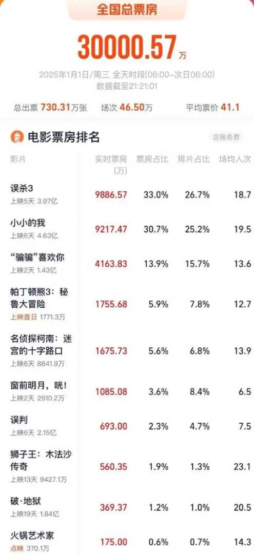 据灯塔专业版数据显示,截至2025年1月1日21时21分,元旦档(1月1日)票房已成功突破3亿元大关。在这一天里,影片《误杀3》、《小小的我》以及《“骗骗”喜欢你》脱颖而出,位居票房榜前三甲,尤其是《误杀3》与《小小的我》更是以强劲的势头领跑整个元旦档期。