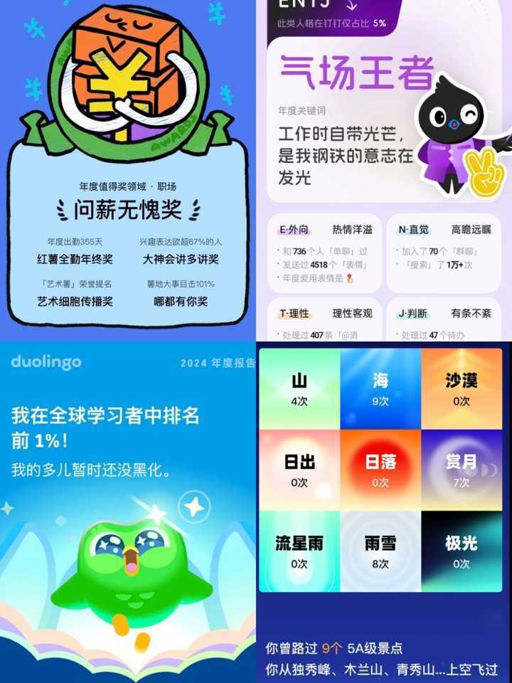 小红书通过颁发各类奖项,如“全勤年终奖”、“年度值得奖”,将年度报告变成了“颁奖现场”;多邻国则通过幽默风趣的语言,强化报告的社交属性;钉钉推出“职场MBTI”,映照打工人的工作日常和职场性格;B站通过视频化页面,制造用户与Up主的双向互动;航旅纵横记录旅行细节,甚至总结用户看过自然景观的次数。而美团则凭借“短剧+AI”的创新形式,赢得了网友的一致好评。