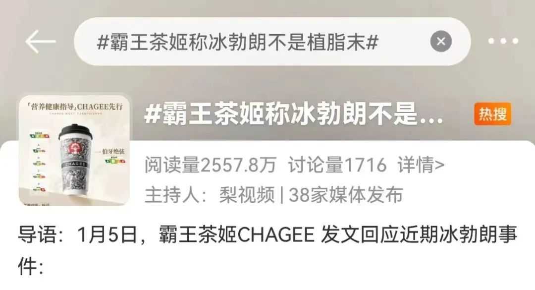 近日,'霸王茶姬称冰勃朗不是植脂末'等话题在微博热搜榜上引起了广泛关注。1月5日深夜,霸王茶姬官方发表声明,针对近期奶茶测评和冰勃朗的议论进行回应。
