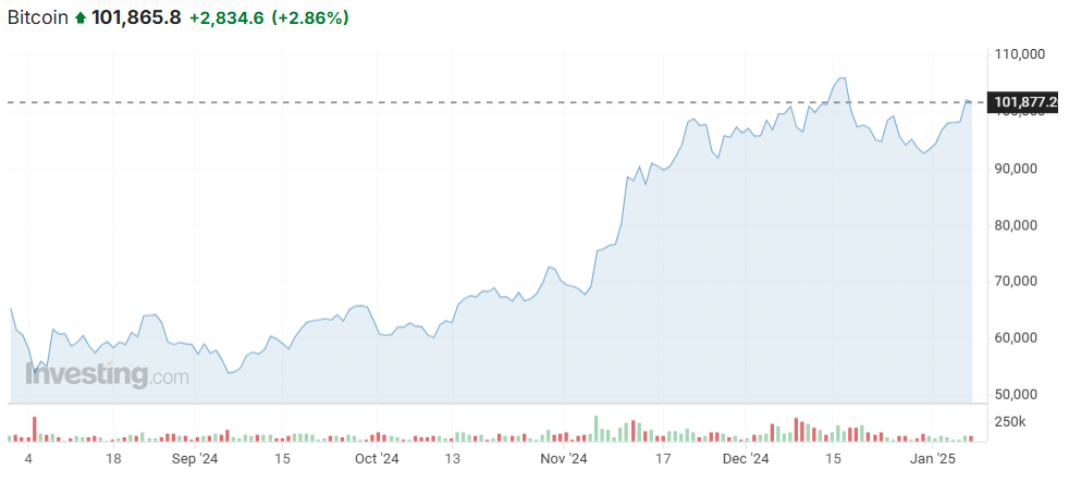 截至发稿时,比特币价格已接近10.2万美元,过去一周内上涨了11%,尽管仍低于去年12月中旬创下的108,268美元的历史高点。