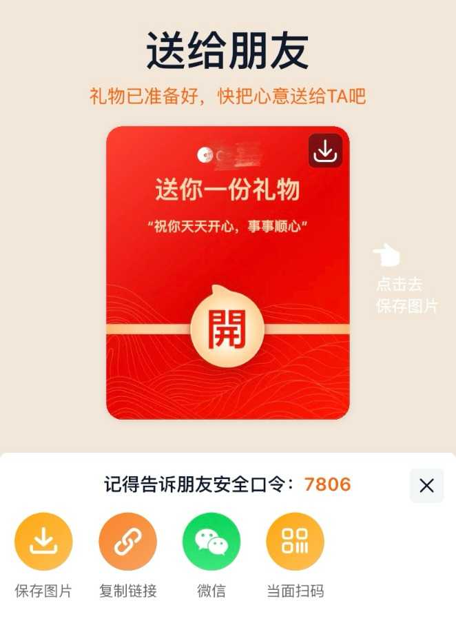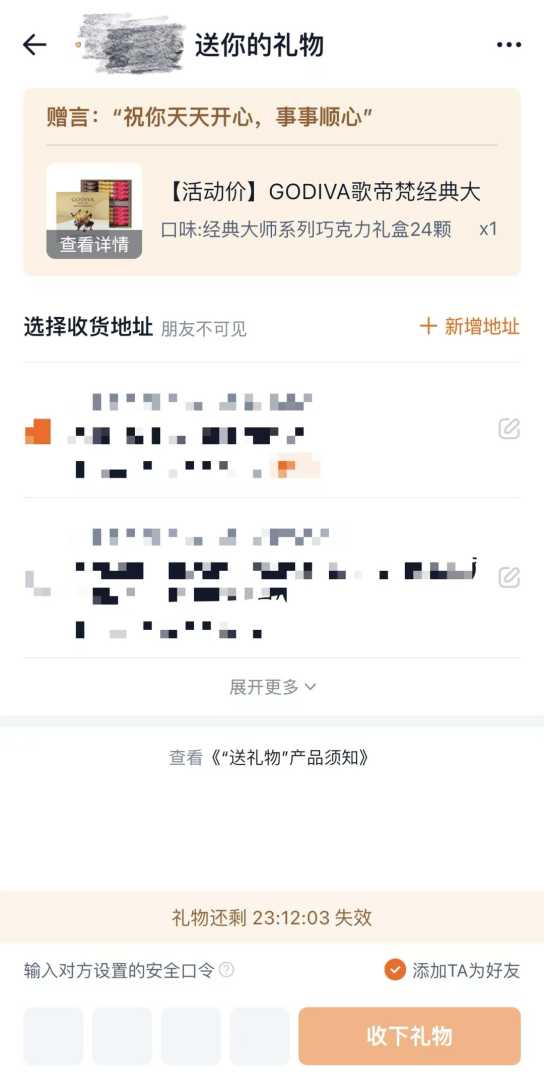 收礼人收到消息后,复制淘口令在淘宝App内打开或直接在微信端内点开淘宝链接,点击“收下礼物”并输入口令,填写收货地址即可完成收礼。
