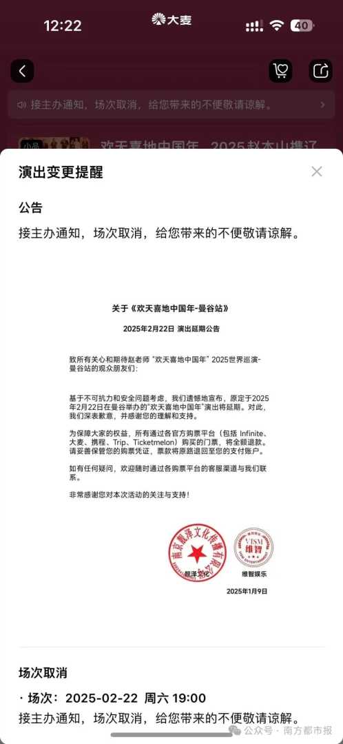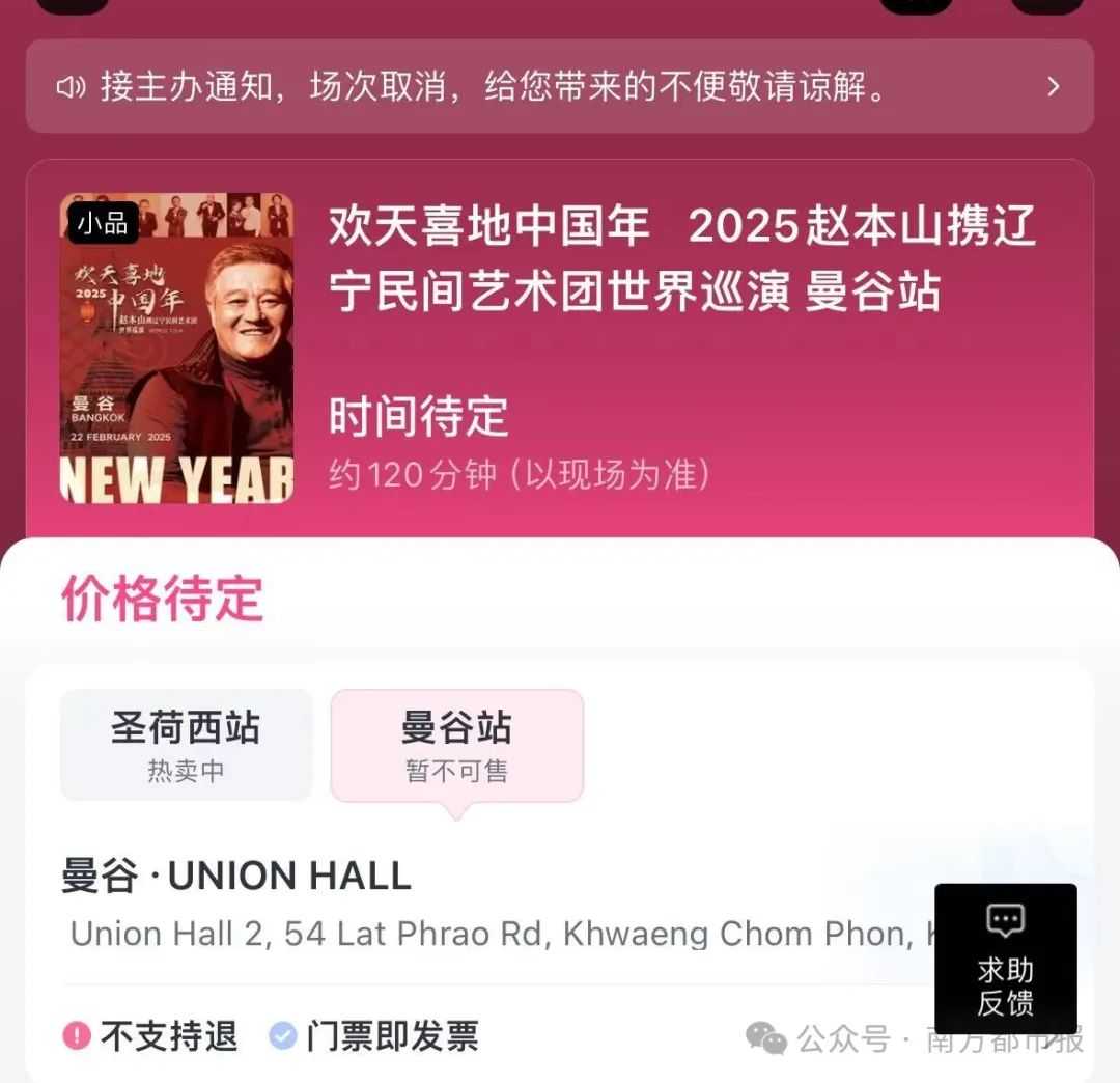 据大麦网APP显示,原计划于2025年2月22日在曼谷举行的“欢天喜地中国年 2025赵本山携辽宁民间艺术团世界巡演曼谷站”演出,已在平台上标记为不可购买,状态显示为“暂不可售”。