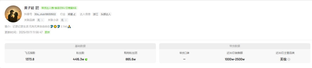 黄子韬作为一位多才多艺的艺人,不仅在音乐、演艺和主持领域有着出色的表现,还在直播带货方面展现出了不俗的实力。飞瓜数据显示,在最近30日内,黄子韬的直播间带货销售额在1000万至3000万元之间,主营品类为美妆产品。