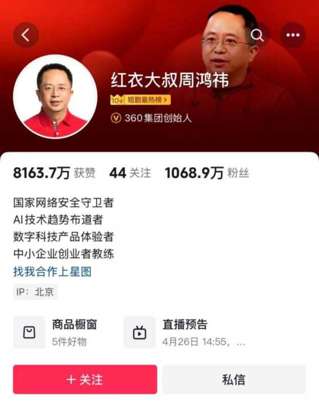 值得注意的是,周鸿祎在1月11日发布的视频中,粉丝数为968.3万。然而,该视频发布后,其粉丝数量迅速增长,截至发稿时,粉丝数已达到1068.9万,一日之内增长了超过100万。