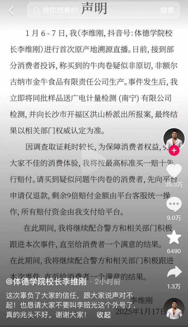 近日,网络红人李维刚在直播带货过程中遭遇消费者投诉,称其销售的“原切肥牛卷”可能并非真正原切,而是“合成肉”。这一事件引发了广泛关注。1月17日,李维刚通过抖音平台发布视频,公开向消费者致歉,并说明事情进展。