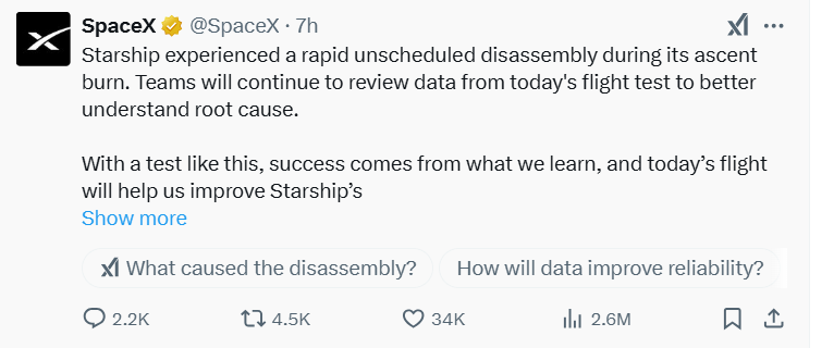 SpaceX“星舰”第七次试飞中,超重型助推器成功回收,但飞船在飞行约8.5分钟后遭遇非计划性解体。SpaceX将与FAA对星舰进行彻底调查,同时计划增加年度发射次数。