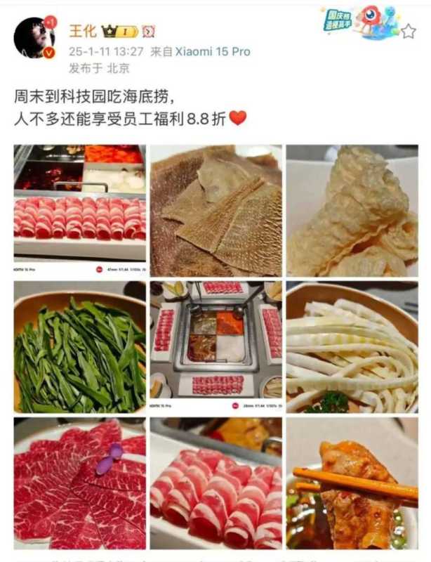 早在1月11日,王化就曾发文表示:“周末到科技园吃海底捞,人不多还能享受员工福利8.8折。”