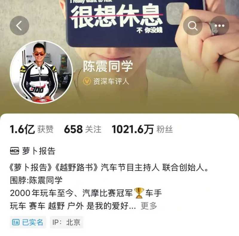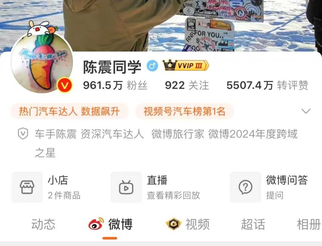 截至目前,陈震在各大社交媒体平台的粉丝总数已突破1900万。