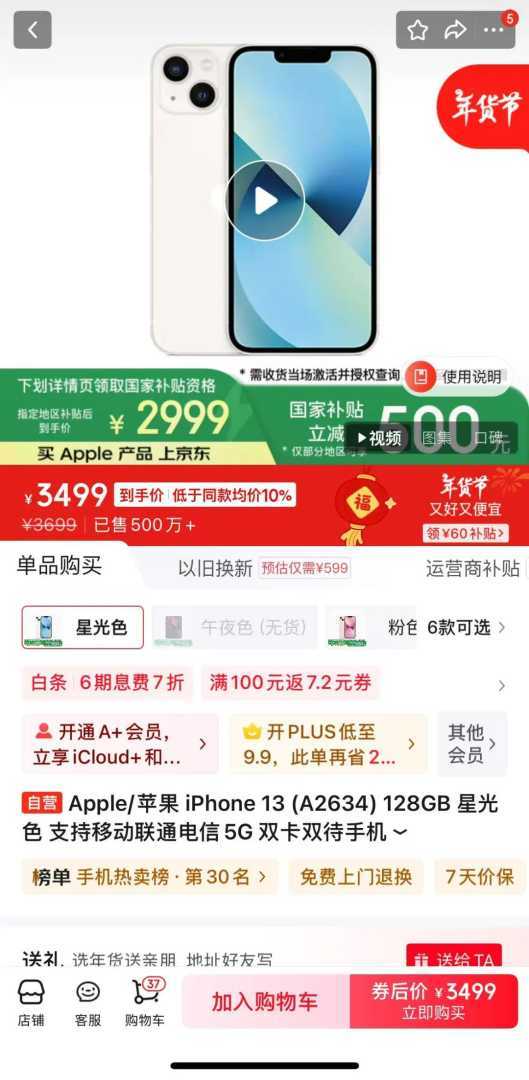 1月21日晚间,微博上多条与iPhone相关的资讯迅速走红。有网友发现,经过国家补贴后,iPhone13 128G版本的到手价格已跌破3000元大关,降至历史最低价。记者在京东平台上的iPhone13销售页面看到,指定地区补贴后的到手价格仅为2999元。