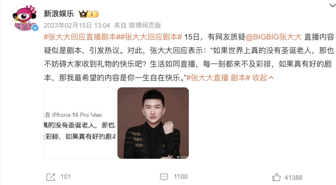 为了保持直播效果的持续稳定,张大大直播间被质疑存在剧本。坊间一直有观点认为,张大大的连麦直播话题经过包装、故意博眼球。虽然张大大本人曾婉转回应过剧本一说,但市场上确实存在专门写剧本的写手、对接主播的助理、培训麦手的导师等相关产业链。