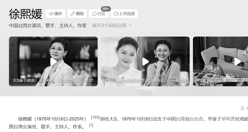 记者随即登陆百度百科,发现关于徐熙媛的个人介绍页面已经变为灰色,以此悼念这位逝去的艺人。同时,多家中国台湾媒体也纷纷报道了这一悲痛的消息。