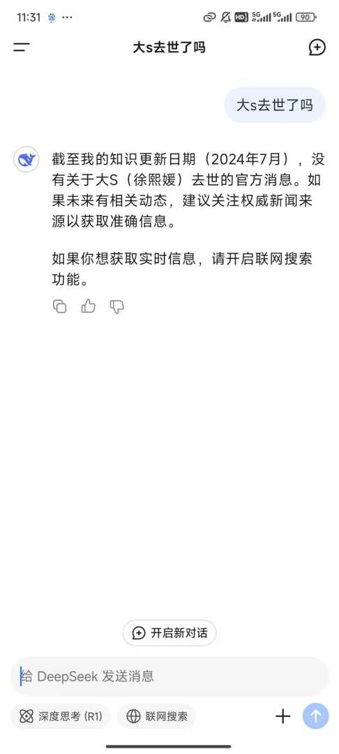 对于“大S去世”这一消息的真实性,记者还咨询了春节期间备受关注的Deepseek人工智能系统。然而,该系统给出的答案是:超出了其知识更新周期。这也提醒我们,在面对网络上的各种信息时,应保持理性思考,避免盲目跟风。