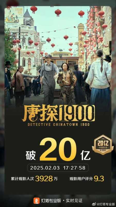 据灯塔专业版实时数据统计,截至2025年2月3日17时27分,备受瞩目的电影《唐探1900》票房成功突破20亿人民币大关,再次彰显了其强大的市场号召力和观众喜爱度。