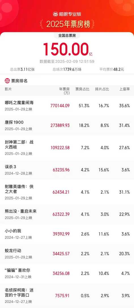 2025年度票房破150亿,《哪吒之魔童闹海》领跑