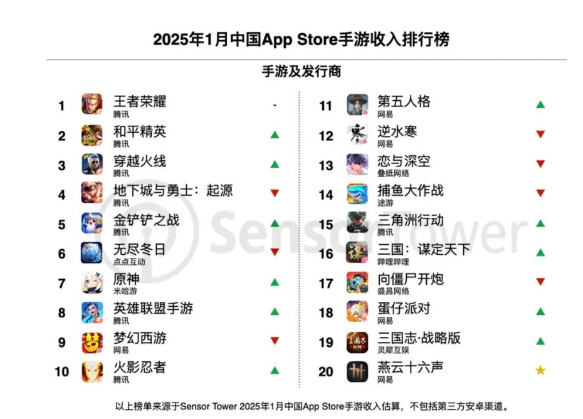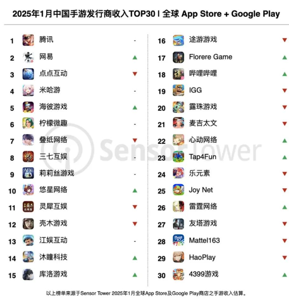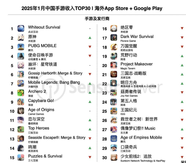 2月10日,移动应用数据分析公司Sensor Tower公布了2025年1月中国手游的出海榜单。受到春节假期的提振,各家游戏也都迎来收入的较大幅度增长。