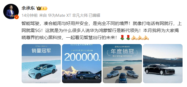 华为系的智界R7和问界M9销量表现强劲,余承东此次发文也被视为为高端车型尊界S800预热。尊界S800预售价100万-150万元,集成多项黑科技。华为与江淮汽车合作,将在智能驾驶、智能座舱等方面深入合作。