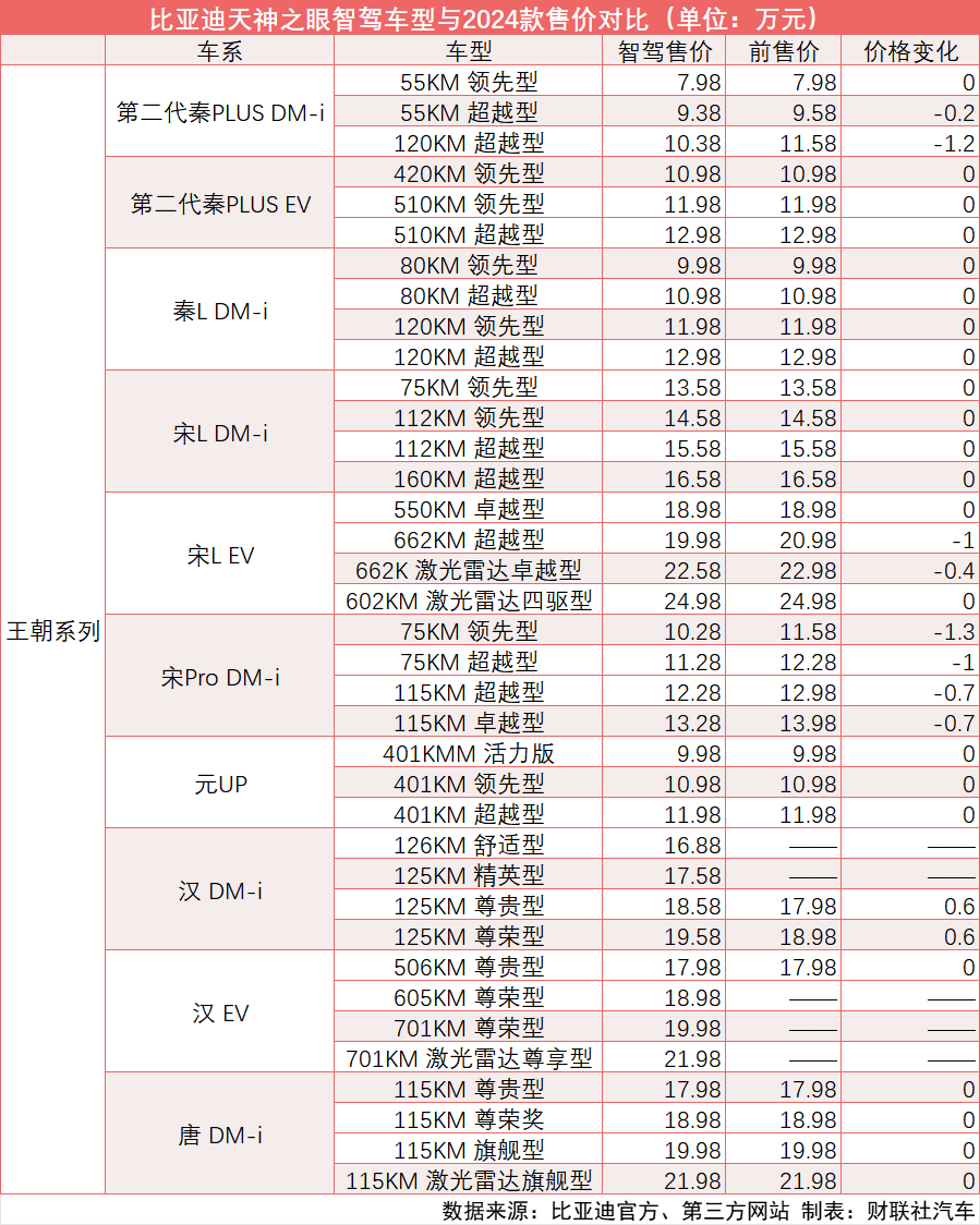 对比比亚迪“天神之眼”智驾版与此前对应车型官方指导价不难发现,除个别车型外,智驾版车型售价几无变化。这也意味着比亚迪此番推出的智驾产品,做到了“加量不加价”。