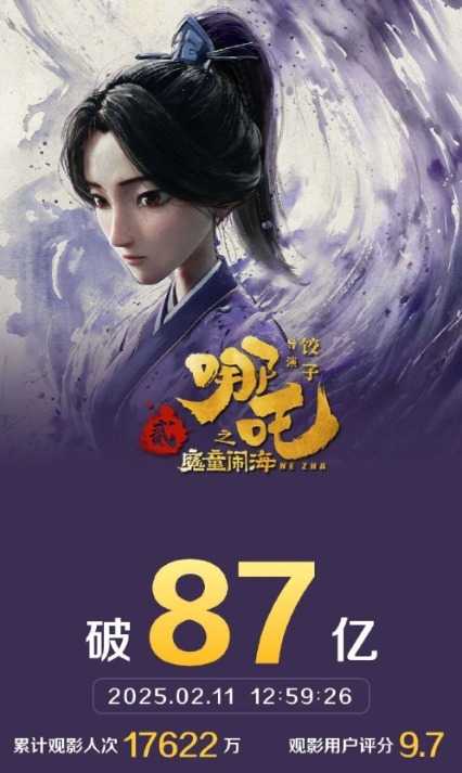 据灯塔专业版实时数据,截至2月11日12时59分,影片《哪吒之魔童闹海》票房突破87亿元。