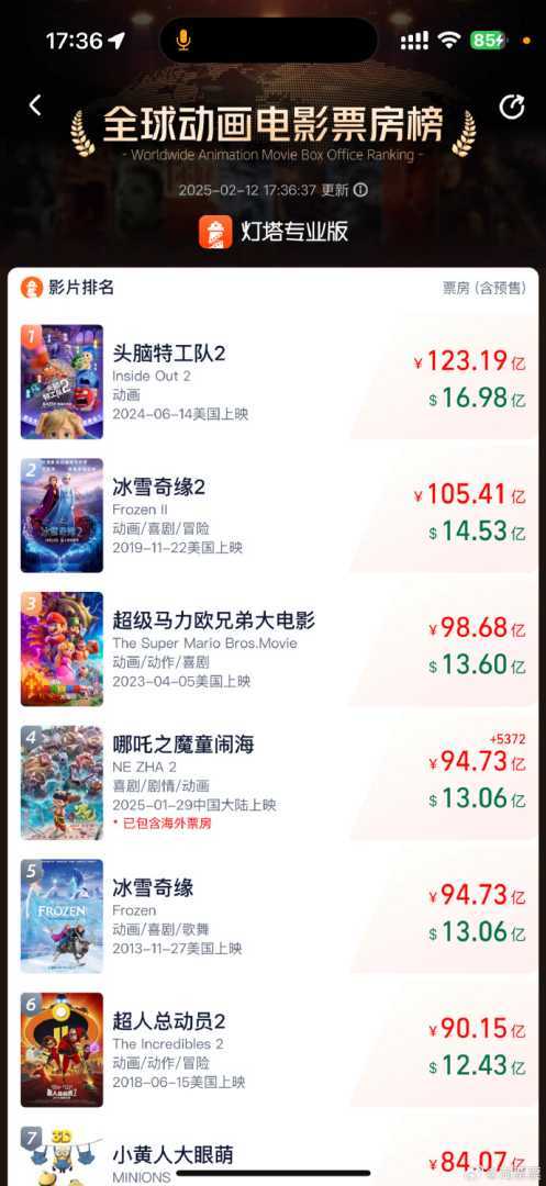据灯塔专业版全球票房榜显示,截至2月12日,影片《哪吒之魔童闹海》总票房(含预售)突破13.06亿美元(含海外点映票房37.0万美元),超过《冰雪奇缘》,进入全球影史票房榜前4名,成为全球动画电影票房TOP4中唯一非好莱坞影片。