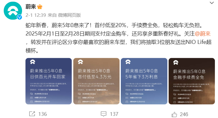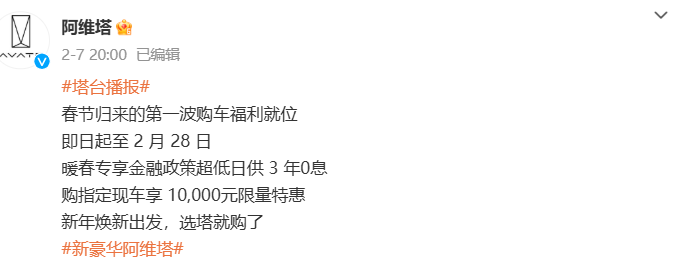 此外,阿维塔、特斯拉、小鹏、蔚来等车企也推出了各自的优惠政策,如阿维塔推出3年0息金融政策及1万元限量特惠;特斯拉对Model 3全系车型提供8000元保险补贴及5年0息贷款政策;小鹏推出“5年0息0首付”政策;蔚来发布5年0息政策,并叠加享受多重新春购车好礼。