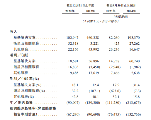 财务数据显示,国星宇航2022年、2023年以及2024年前三季度的收入分别为1.77亿元、5.08亿元以及2.37亿元。目前公司仍处于净亏损状态,同期分别亏损9090.7万元、1.39亿元以及2.14亿元。对于持续亏损的原因,公司方面表示:“我们的亏损状况主要是由于以下因素的综合影响,一是卫星及相关服务的毛利率波动;二是相对较高的研发开支及一般行政开支。”