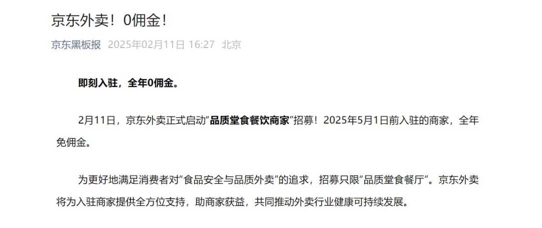 2月11日,京东外卖宣布,启动“品质堂食餐饮商家”招募,2025年5月1日前入驻的商家,全年免佣金。根据京东发布的消息,招募只限“品质堂食餐厅”,源于为更好地满足消费者对“食品安全与品质外卖”的追求。