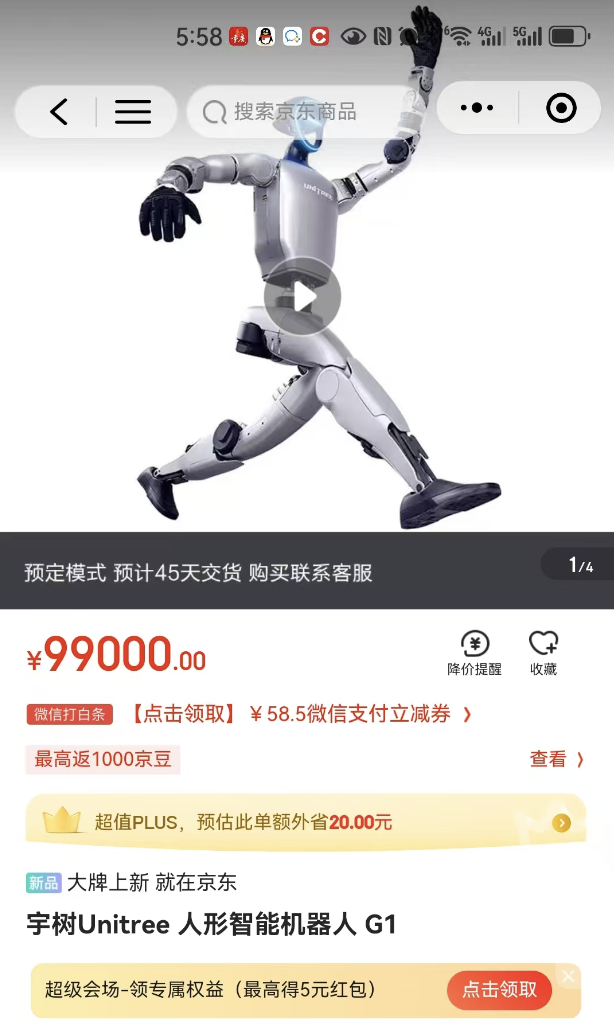 目前,Unitree G1人形机器人在线上的售价为99000元,预计45天可交货。Unitree H1人形机器人售价为650000元,预计60天可交货。