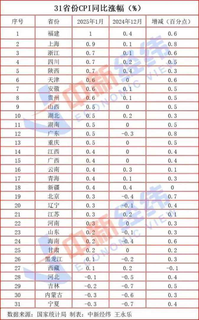 31省份1月CPI出炉:27地上涨,宁夏“11连降”