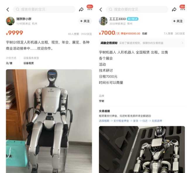 宇树科技是首家将人形机器人放上线上渠道售卖的公司,此波预热在市场上掀起了一股抢购热潮。淘宝、闲鱼等平台上已出现提供机器人租赁服务的商家,租金价格7000~15000元不等,G1一天租金1万元,附赠技术服务人员。现货二手加价2万左右,约12万元。5年前,人形机器人售价高达千万,主要用于教育领域,采用手柄控制,面向B端市场。现在市面上宇树机器人供不应求,交付周期长,普遍2个月。