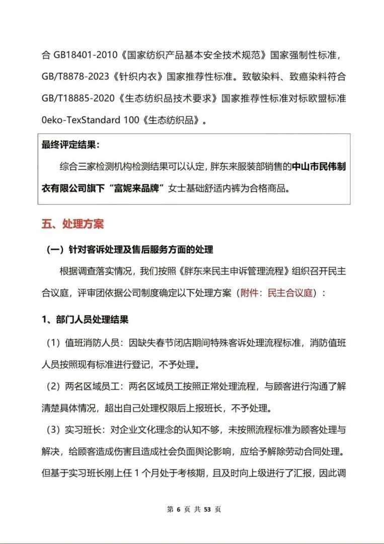 胖东来表示,事件对顾客造成很大困扰和伤害,真诚道歉。2月14日,胖东来发布调查报告,认定涉事内裤为合格商品。对实习班长、值班课长等人员进行处理,给予顾客500元投诉奖,并承担相关医疗费用。