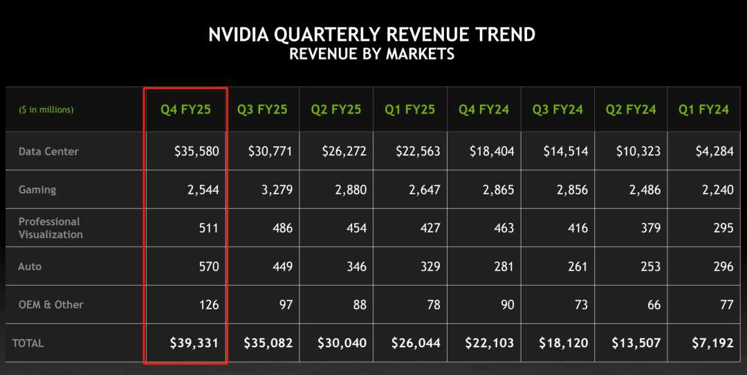 英伟达Q4实现营收393.31亿美元,较去年同期增长78%,分析师预期为380.5亿美元;其中数据中心业务大放异彩,营收达到355.8亿美元,同比增长93.32%;