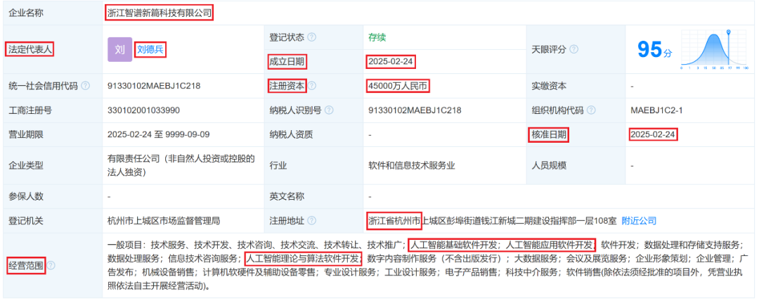 浙江智谱新篇科技有限公司在杭州市注册成立,注册资本为4.5亿元,业务范围广泛,包括人工智能基础软件开发等。