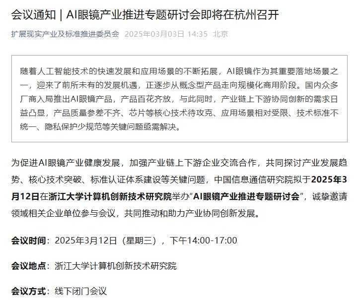 中国信息通信研究院宣布将于2025年3月12日在浙江大学举办AI眼镜产业推进专题研讨会,旨在加强产业链交流合作,探讨AI眼镜产业发展趋势、核心技术突破及标准认证体系建设等关键问题。