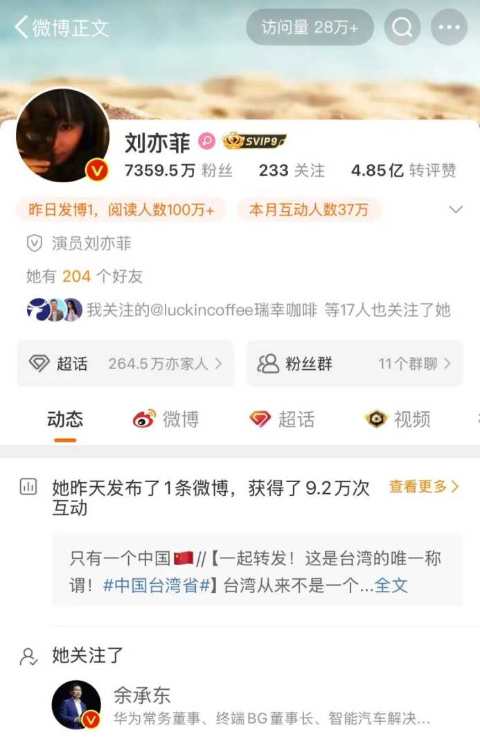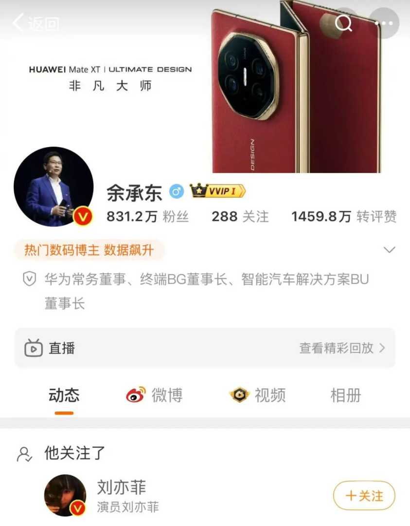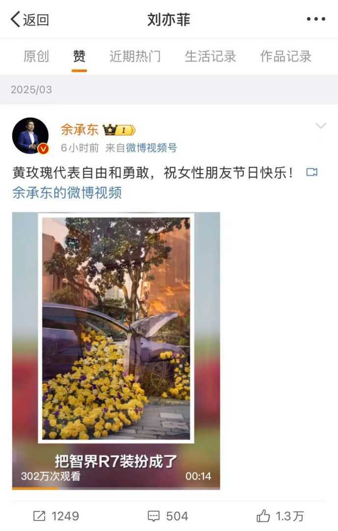 据悉,演员刘亦菲和华为常务董事余承东互相关注了对方微博,并引发市场猜测。当天,余承东发布了一条视频,配文:“黄玫瑰代表自由和勇敢,祝女性朋友节日快乐!”视频中展示了装扮了大量黄玫瑰的智界R7,刘亦菲也点赞了该条微博。