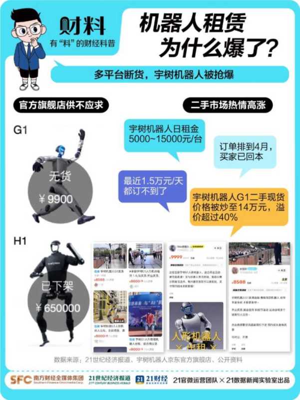 宇树人形机器人H1在2025年蛇年春晚凭借其流畅的舞姿和精准的互动能力成为开年“网红”。目前宇树机器人多平台断货,二手市场溢价40%,涌现大量出租商家,日租金最高达2万元。