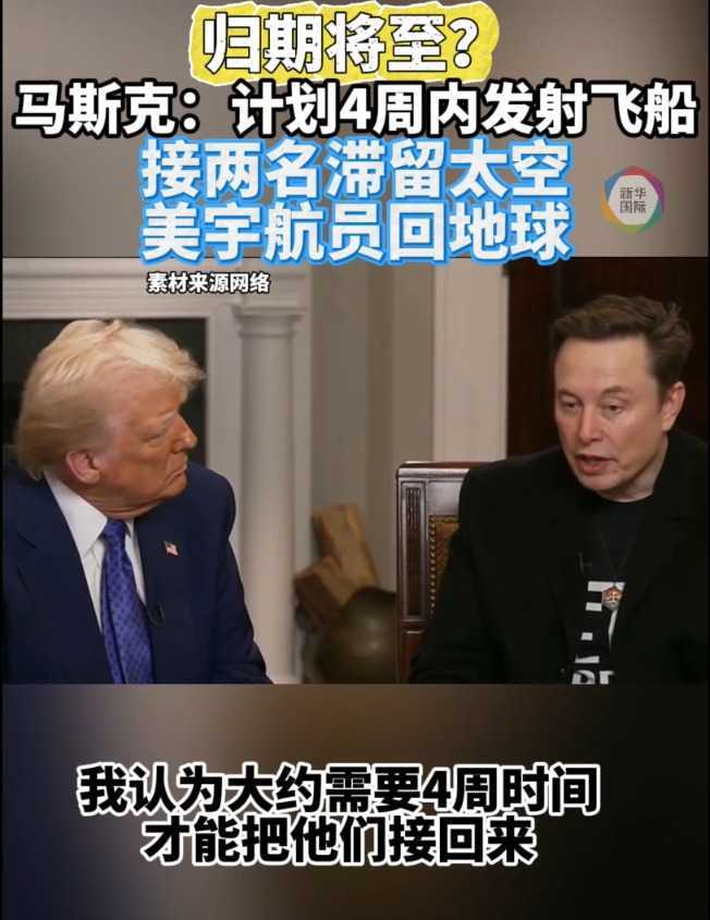 此外,SpaceX首席执行官埃隆·马斯克在访谈中宣布,他计划在大约四周内接回滞留太空的两名美国宇航员。美国总统特朗普对此表示支持,并批准了马斯克的计划。