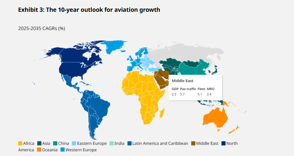 国际知名管理咨询公司奥纬咨询(Oliver Wyman)发布报告,预测2025年至2035年间,中东地区商业航空公司机队将迎来显著增长,复合年增长率将达到5.1%,远超全球2.8%的平均水平。