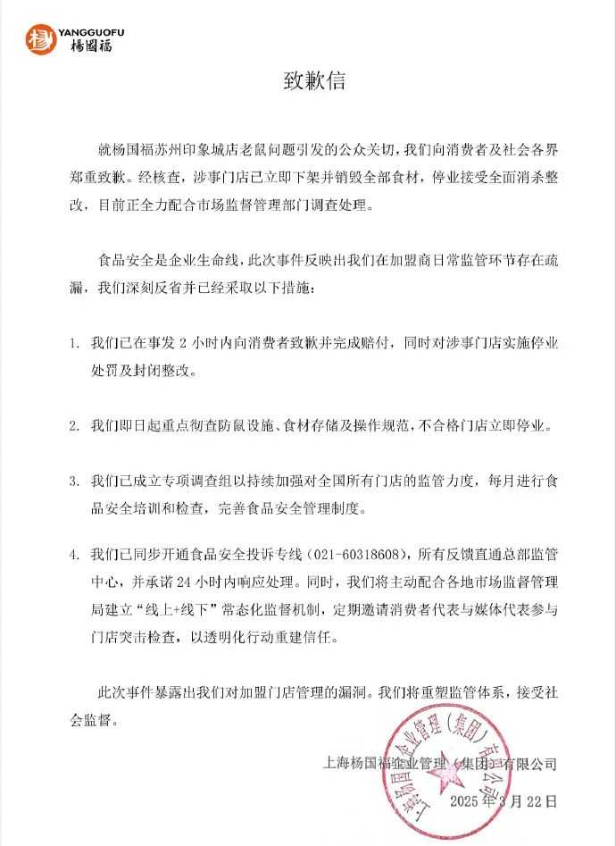 3月22日,上海杨国福企业管理(集团)有限公司(简称“杨国福”)在官方微博发布致歉信,回应杨国福苏州印象城店出现的老鼠问题,这一事件引发了广泛关注。