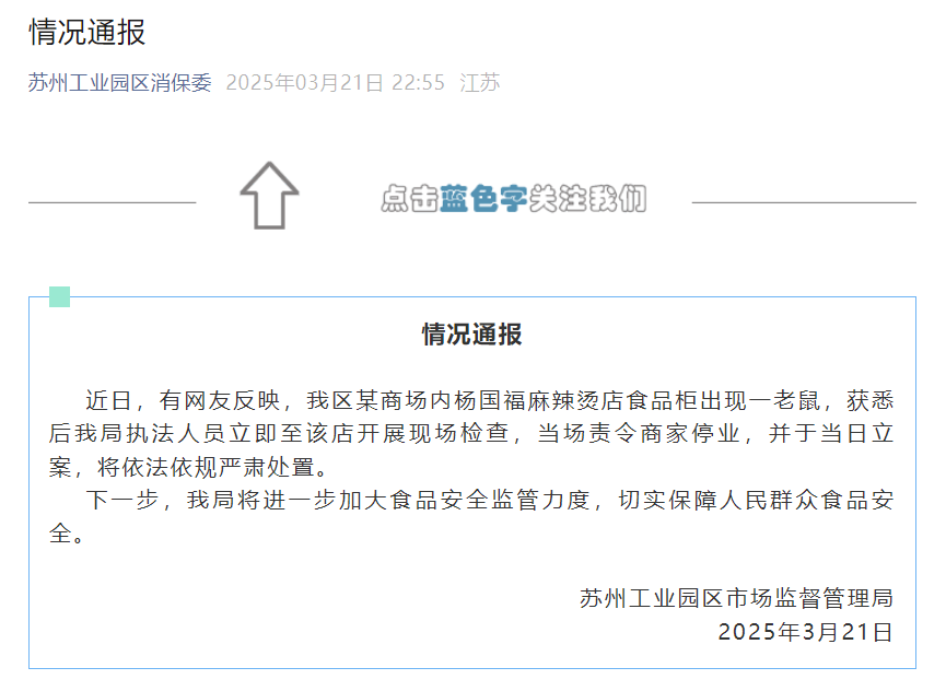 早前,苏州工业园区市场监督管理局发布情况通报,称近日有网友反映该区某商场内杨国福麻辣烫店食品柜出现老鼠。获悉情况后,该局执法人员立即赶往现场检查,当场责令商家停业,并于当日立案,表示将依法依规进行严肃处理。
