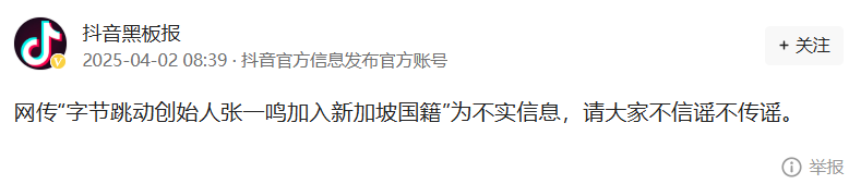 据抖音黑板报4月2日消息,网传“字节跳动创始人张一鸣加入新加坡国籍”为不实信息,请大家不信谣不传谣。