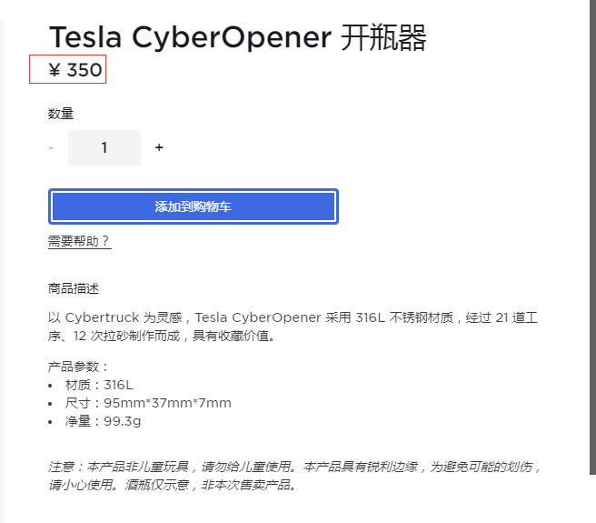 特斯拉在中国官网上架Tesla CyberOpener开瓶器,售价350元,引发网友热议。特斯拉周边产品价格不菲,马斯克宣传CyberTruck哨子时还不忘嘲讽苹果抛光布。