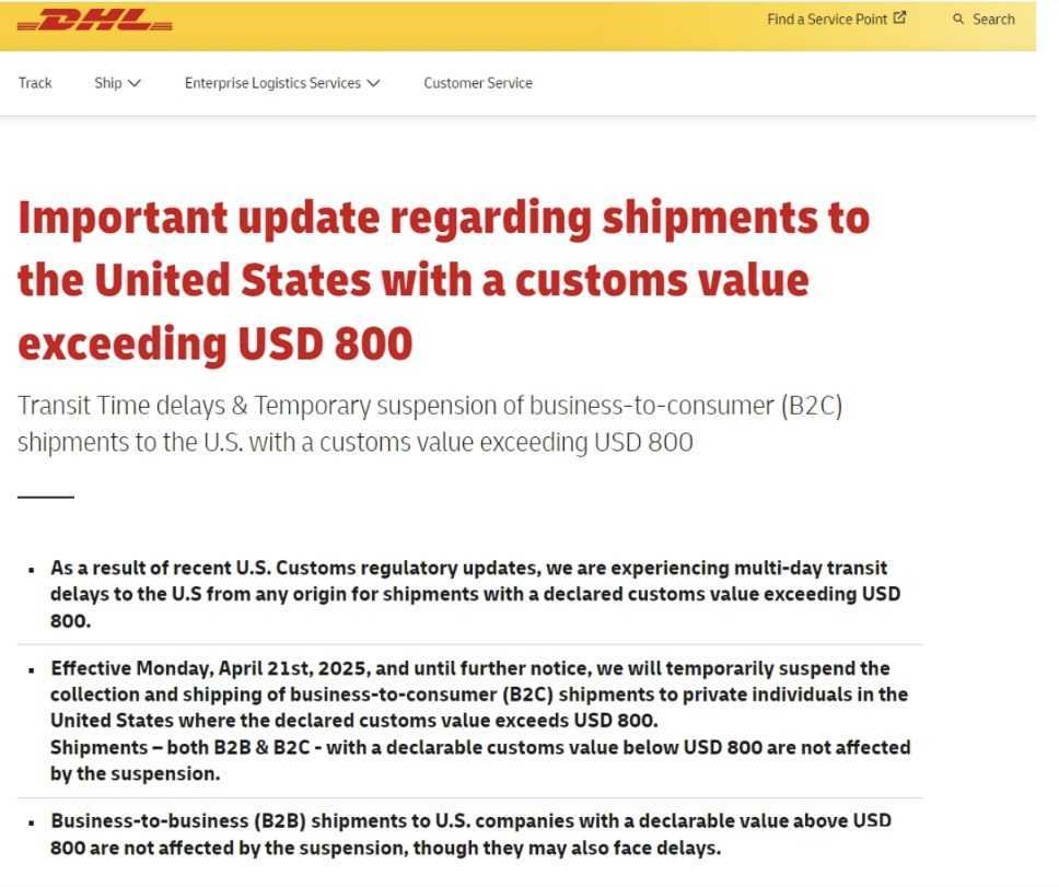 DHL快递正全力提升清关处理能力,但由于美国海关新规实施仓促,所有申报价值超过800美元的货物(无论原产国)均可能出现多日延迟。为确保服务质量,DHL快递决定自4月21日起临时暂停受理向美国个人消费者发送的申报价值超过800美元的B2C货物,直至另行通知。目前,申报价值低于800美元的货物仍可适用小额包裹关税豁免并简化清关流程。