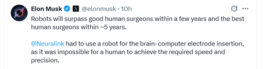 在回复科技评论员Mario Nawfal在社交媒体上的帖子时,马斯克明确表示,“机器人将在几年内超过优秀的人类外科医生,并在大约5年内超越人类最好的外科医生。”这一言论立即引起了热议。