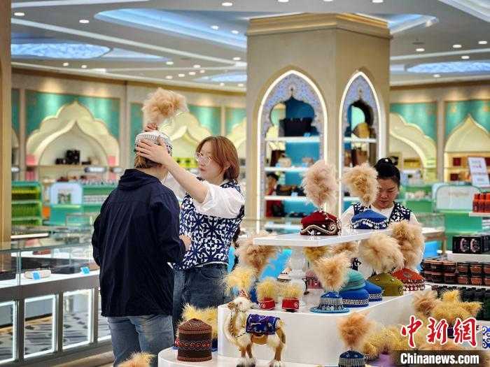 在中哈霍尔果斯国际边境合作中心一商贸城内,哈萨克斯坦游客达娜·玛科莎耶娃正精心挑选礼物。“节假日我常来这里,为家人选购特色商品。”