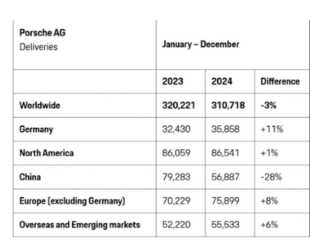 保时捷2024年各主要市场销量,图片来源:保时捷。