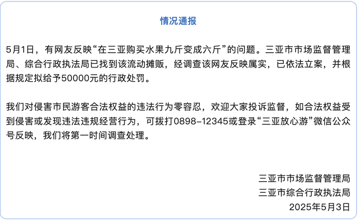 5月3日,三亚市市场监督管理局通报,针对5月1日有网友反映在三亚购买水果九斤变成六斤的问题,已找到摊贩并确认属实,依法立案并拟给予50000元行政处罚,维护市场秩序和消费者权益。