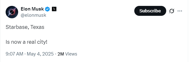 美国太空探索技术公司(SpaceX)火箭制造与发射基地所在的得克萨斯州南部墨西哥湾沿岸地区于5月3日投票,以173票赞成、4票反对的结果,决定将当地升级为一座名为“星舰基地”的城镇,远超所需的143票赞成,“星舰基地”成为城镇已成定局。