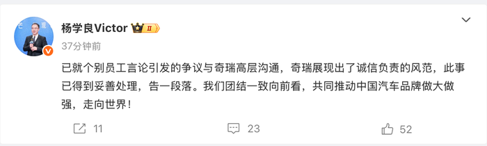针对奇瑞高管在社媒拉踩吉利新车事件,浙江吉利控股集团高级副总裁杨学良5月12日下午在社交平台发文回应,表示已就个别员工言论引发的争议与奇瑞高层沟通,展现了诚信负责的风范,此事已得到妥善处理。双方将团结一致,共同推动中国汽车品牌做大做强,走向世界!