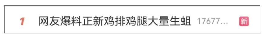 5月15日,“网友爆料正新鸡排鸡腿大量生蛆”相关话题在微博上引起广泛关注,迅速登上热搜。